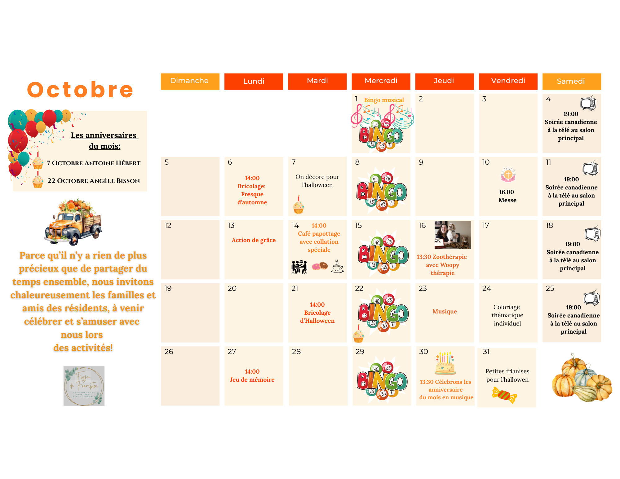 Vous pouvez participer à une variété d'activités artistiques comme le chant, la danse, et la peinture, ainsi qu'à des jeux de société et des fêtes. Vous bénéficiez aussi de zoothérapie, d'activités religieuses et de l'accès à la câblodistribution pour un confort optimal.